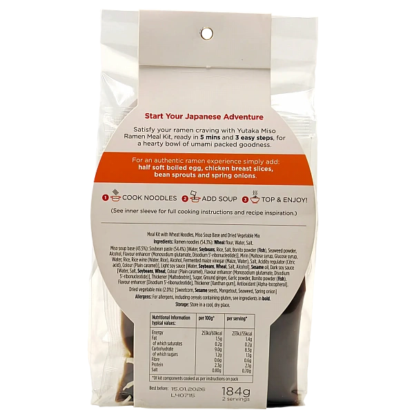 Miso soup base (43.5%): Soybean paste (54.4%) [Water, Soybeans, Rice, Salt, Bonito powder (Fish), Seaweed powder Alcohol, Flavour enhancer (Monosodium glutamate, Disodium 5'-ribonucleotide)], Mirin [Maltose syrup, Glucose syrup, Water, Rice, Rice wine (Water, Rice), Alcohol, Fermented maize vinegar (Maize, Water), Salt, Acidity regulator (Citric acid), Colour (Plain caramel)], Light soy sauce [Water, Soybeans, Wheat, Salt, Alcohol], Sesame oil, Dark soy sauce [Water, Salt, Soybeans, Wheat, Colour (Plain caramel), Flavour enhancer (Monosodium glutamate, Disodium 5-ribonudeotide)], Thickener [Maltodextrin], Sugar, Ground ginger, Garlic powder, Bonito powder (Fish), Flavour enhancer [Disodium 5-ribonucleotide], Thickener [Xanthan gum], Antioxidant [Alpha-tocopherol].